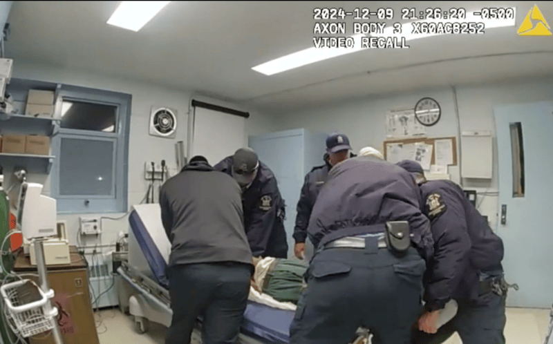 The footage was made public on the attorney general’s website and shows a visibly battered prisoner named Robert Brooks handcuffed with his hands behind his back in a medical examination room. A group of correctional officers can be seen struggling and physically assaulting the man, including punching and kicking him while on an exam table with his hands behind his back.