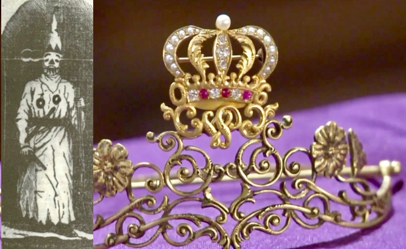 The bejeweled tiaras were given to local white women by a group called the Veiled Prophet Ball, which was started by a secret society in 1878 by elites who were angry about a railroad strike and the participation of black people in that strike. Members of the Veiled Princess group dressed exactly like members of the Klu Klux Klan and carried weapons.