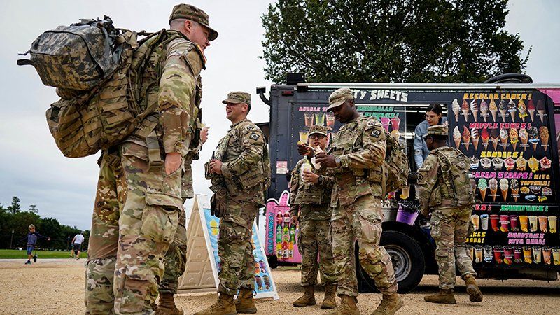 Photos captured them standing around in extreme heat and humidity. Last week, they were seen grabbing ice cream from a food truck and guarding the Krispy Kreme. In the past few days, it seems to have evolved into Guard soldiers picking up trash and spreading mulch around the landscaping in the city.
