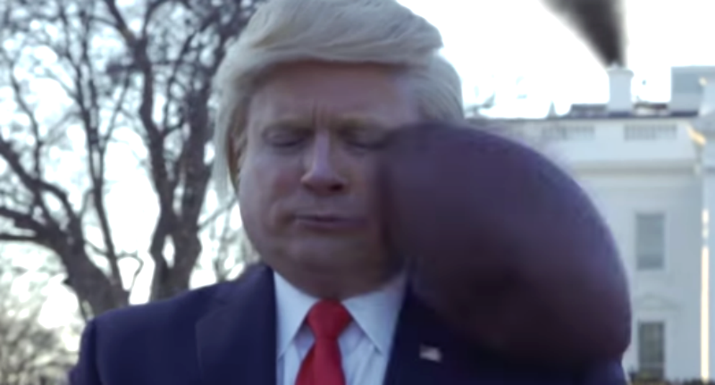 "Mr. President!" the quarterback yells, accidentally hitting the faux-Trump in the face with a football while he's tweeting about installing coal fireplaces in the White House.