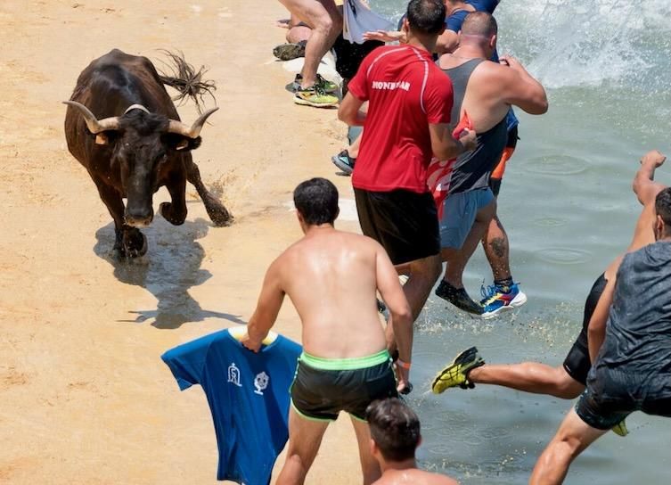 There are also "bous a la mar" -- races to the seafront where at the end of the run, the participants vie to try and make the bulls fall into the water, most ending up there themselves.
