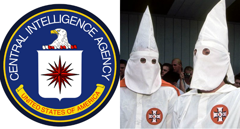 The seal of the CIA (left, via Wikimedia Commons) and two members of the KKK (right, via Shutterstock).