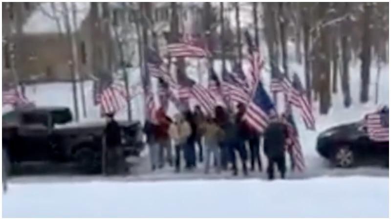 The video shows a line of trucks and vehicles outside his home with protesters carrying American flags and other flags with "Stand for the flag, kneel for the cross" slogans, and Gadsden flags.