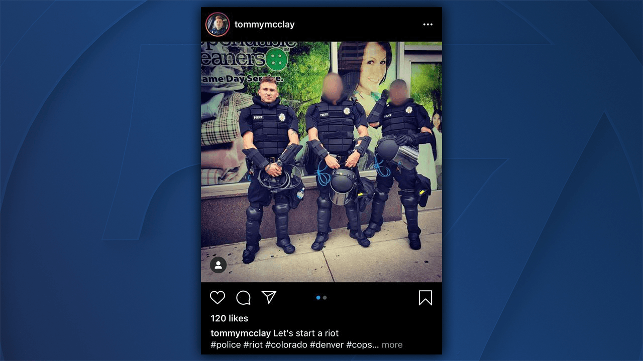 The Denver Channel reports that Denver police officer Tommy McClay and the two other officers shown in his Instagram photo have been reassigned and will no longer be handling anti-police brutality protests after the image went viral on Reddit.