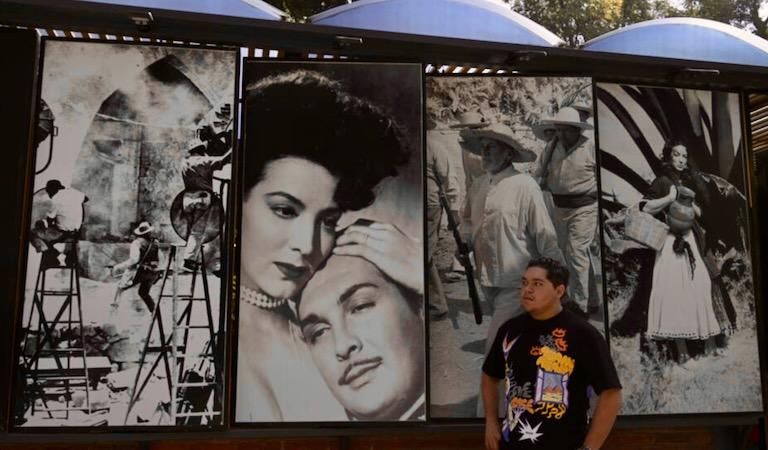 A man is seen next to photographs of actors from the golden age of Mexican cinema, at the Churubusco studios in Mexico City© Pedro PARDO / AFP