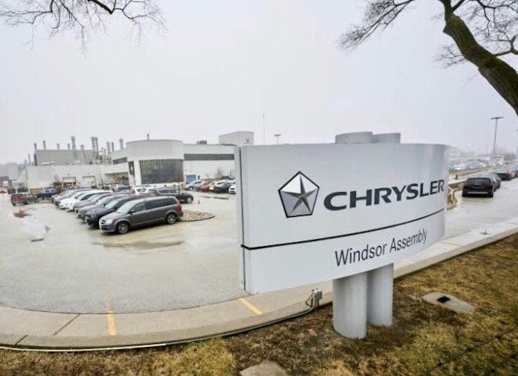 The Chrysler Windsor Assembly Plant sign sits at the edge of the Stellantis facility in Windsor, Ontario, Canada, on January 31, 2025 (Geoff Robins/AFP)