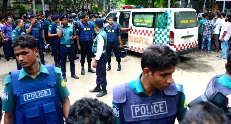 Bangladeshi police man an intersection of a street leading to an upscale restaurant after a bloody siege ended in Dhaka on July 2, 2016 (AFP)