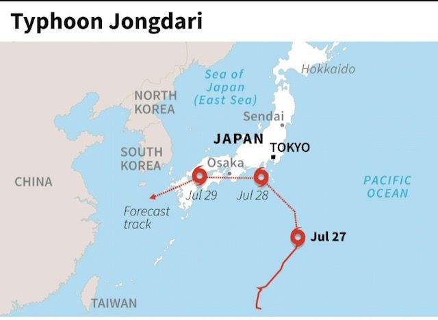 Typhoon Jongdari, packing winds of up to 180 kilometres (110 miles) an hour, is forecast to make landfall on the country's main island on Saturday night or early Sunday, according to Japan's Meteorological Agency.