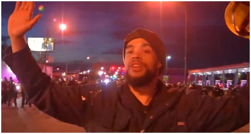 As Miles Carter spoke to a news crew with his hands symbolically in the air, a contingent of riot police approached him from behind and violently tackled him to the ground while swinging their batons at the news crew.