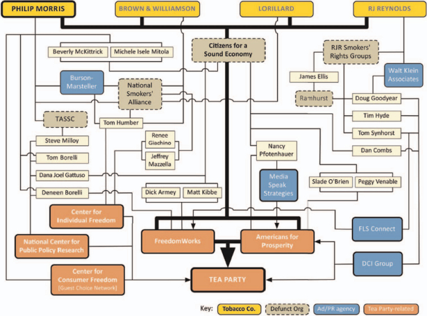 Fallin used the Legacy Tobacco Documents Library at the University of California, San Francisco, to examine tobacco company memos on marketing and lobbying strategies going back to the 1980s and 1990s, as the companies struggled to oppose new regulations and taxes, and created an organizational flowchart (see below) that draws direct lines from tobacco companies to the modern day tea party.
