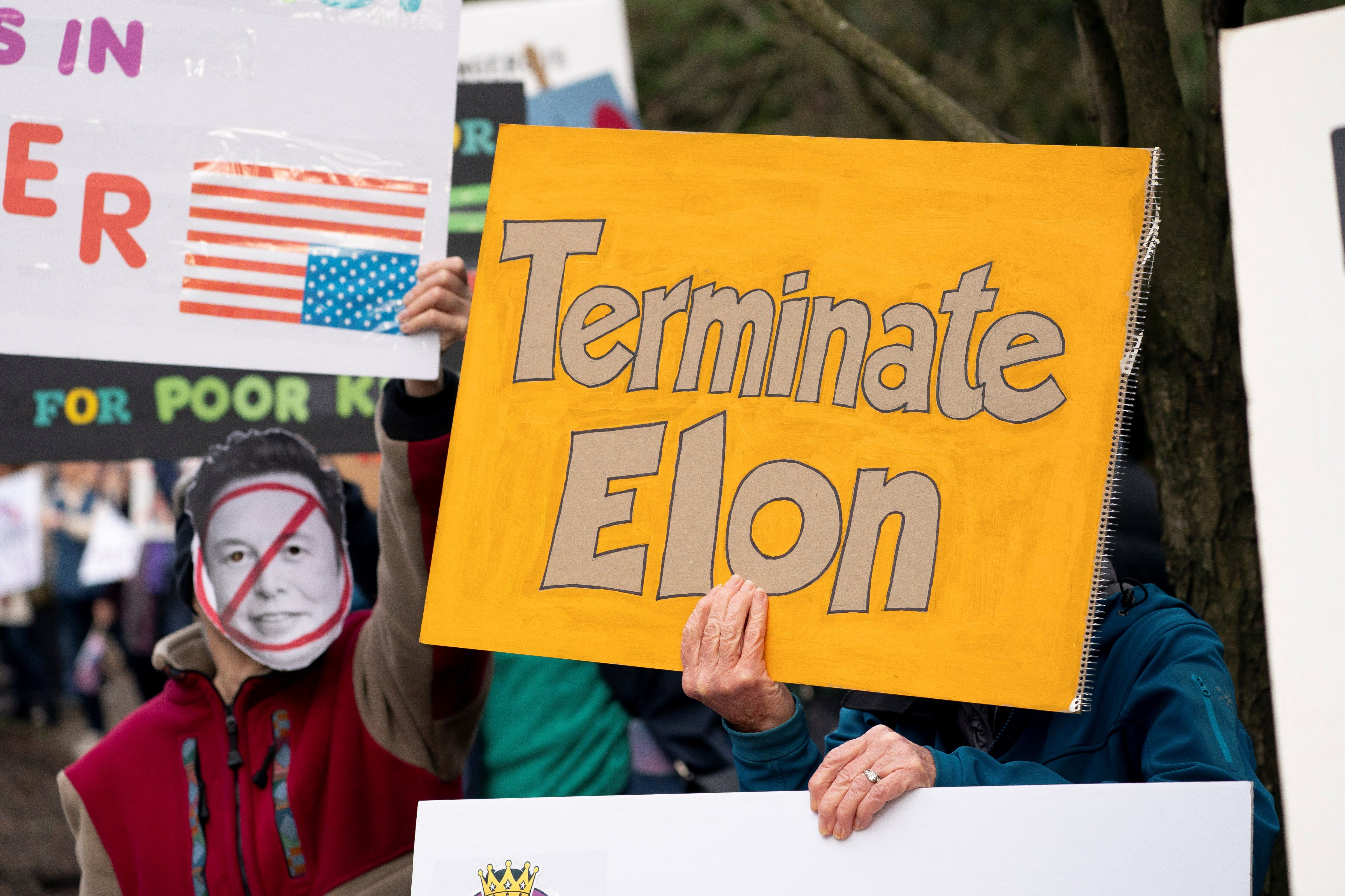 Demonstrators gather for a protest outside SpaceX and Starlink facilities in Redmond, Washington, U.S., February 26, 2025. REUTERS/David Ryder