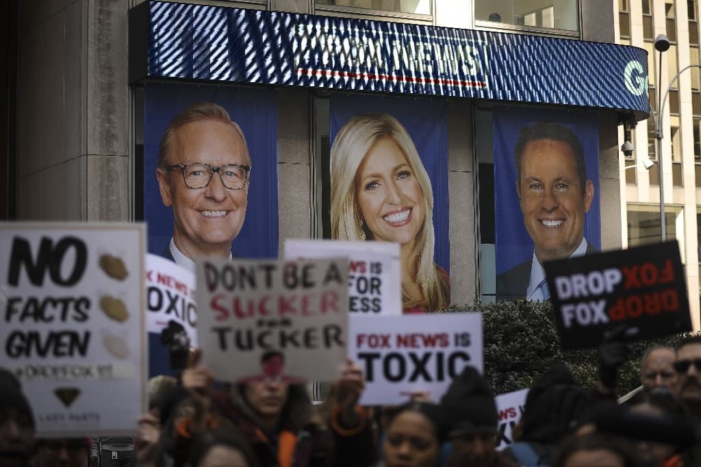 Protestors outside Fox News, which is being sued for $1.6 billion by Dominion Voting Systems