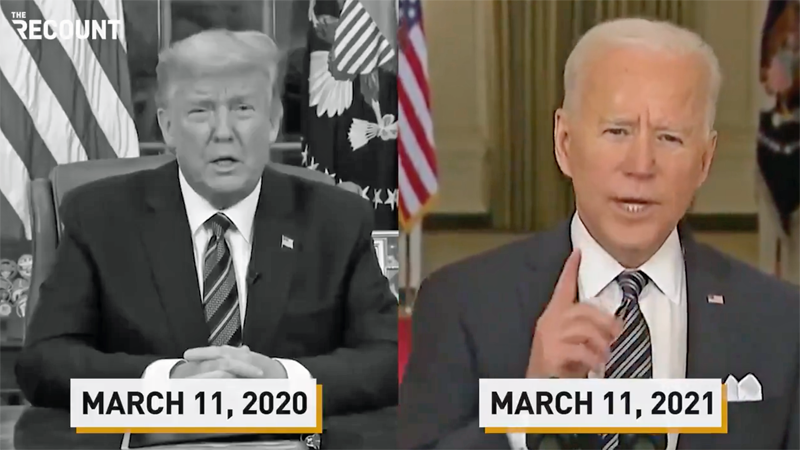One year after then-President Donald Trump discussed his views on coronavirus during an Oval Office address, President Joe Biden gave his first prime-time address on the same subject.