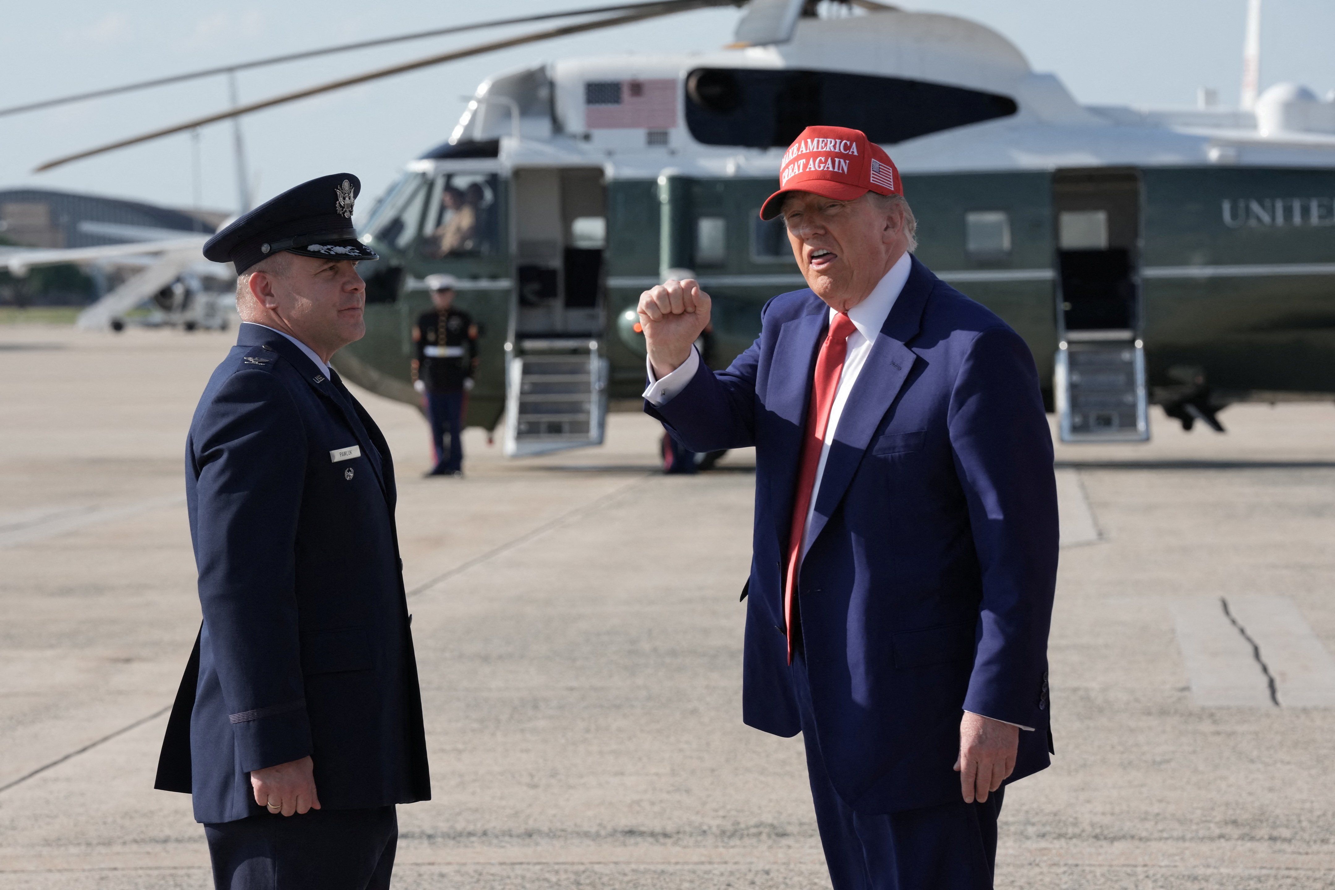U.S. President Donald Trump gestures upon arrival at Joint Base Andrews, Maryland, U.S., June 21, 2025. REUTERS/Ken Cedeno