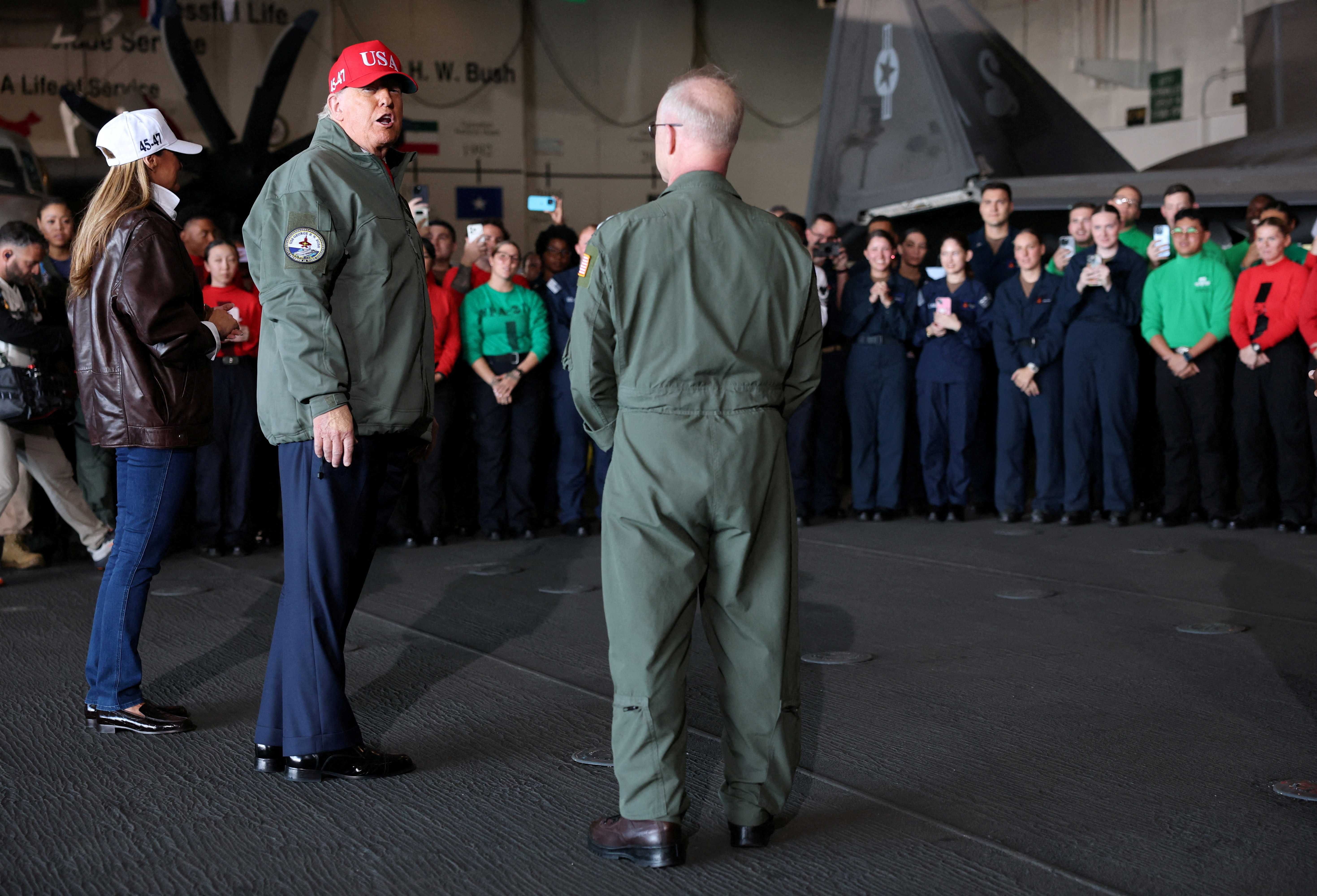“This is a rally,” Trump said, speaking on a stage positioned between two warships. “This is sort of a rally, let’s face it.”