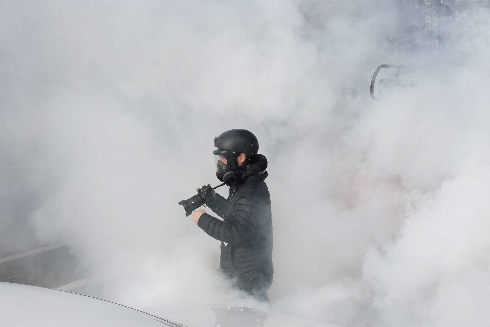 A photographer stands among a cloud from a riot control grenade in Minneapolis. REUTERS/Tim Evans
