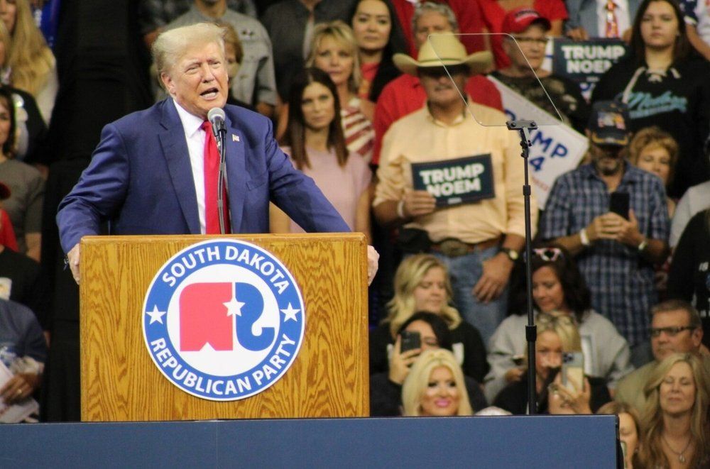 Former President Donald Trump speaks during a rally Sept. 8, 2023, at The Monument in Rapid City. (Seth Tupper/South Dakota Searchlight)