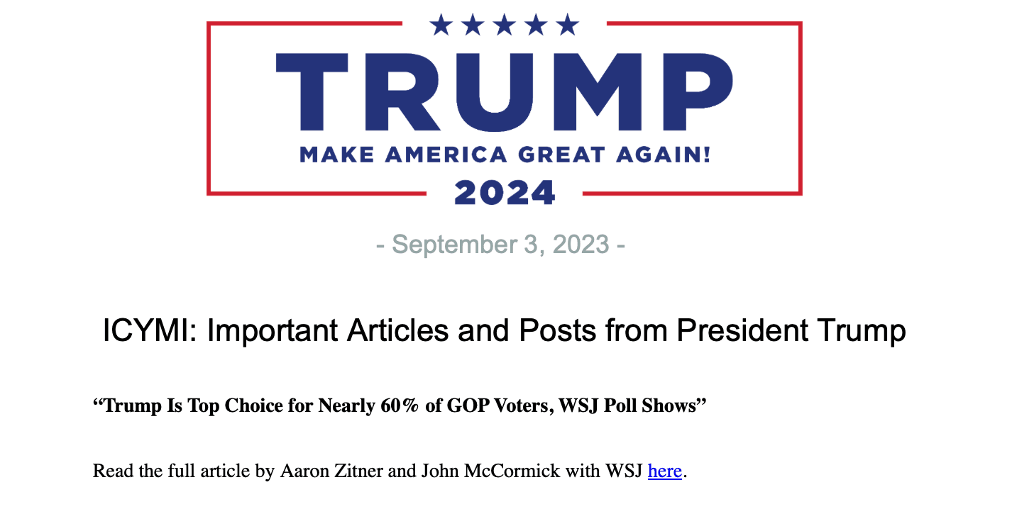 But Trump’s Sept. 3 email news round-up led with a story from the Wall Street Journal reporters Aaron Zitner and John McCormick, headlined: “Trump Is Top Choice for Nearly 60% of GOP Voters, WSJ Poll Shows”