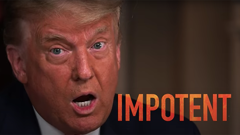 The worst moment comes when the ad notes, "now everyone is saying you're old, impotent, [and] an embarrassment." The ad likely doesn't mean impotent as in the male virility problem. The Lincoln Project presumably means "lacking power."