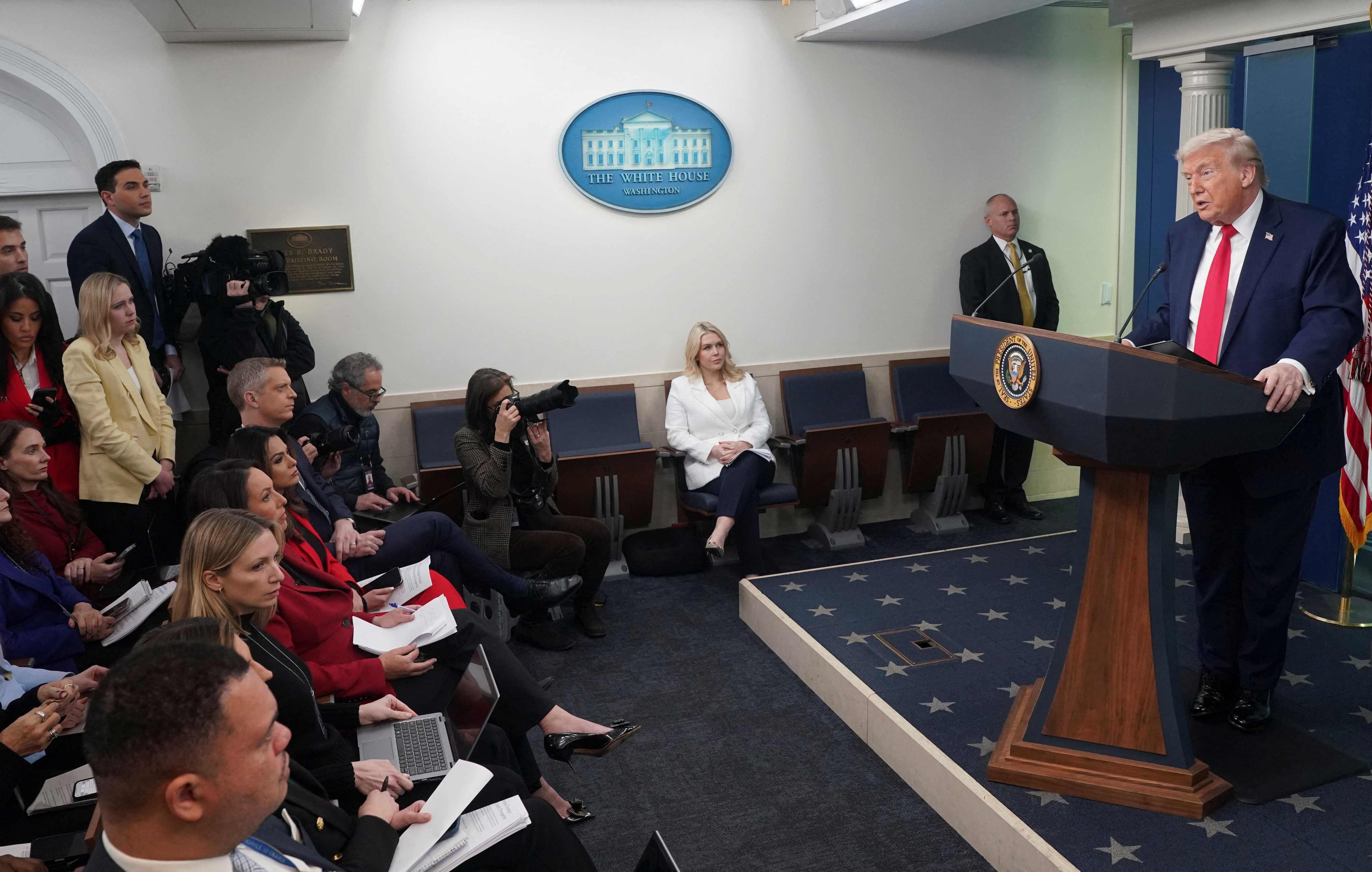 Trump walked up to the podium at the White House press briefing room with a large stack of bound papers labeled "accomplishments" and started blaming former President Joe Biden, giving an unusual slideshow presentation show placards of alleged suspects wanted by ICE.