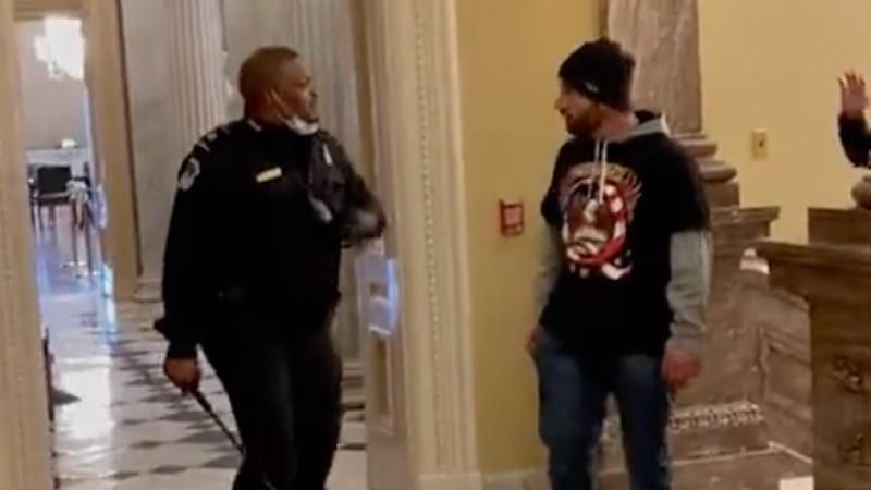 The man who was seen wearing a QAnon T-shirt while confronting Capitol Police Officer Eugene Goodman on Jan. 6, 2021 is now seeking to have his FBI interview suppressed, NBC News correspondent Ryan Reilly reports.