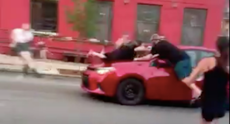 A separate video showed a white man wearing a face covering jump out of the passenger side door to move a rental scooter from the car's path.