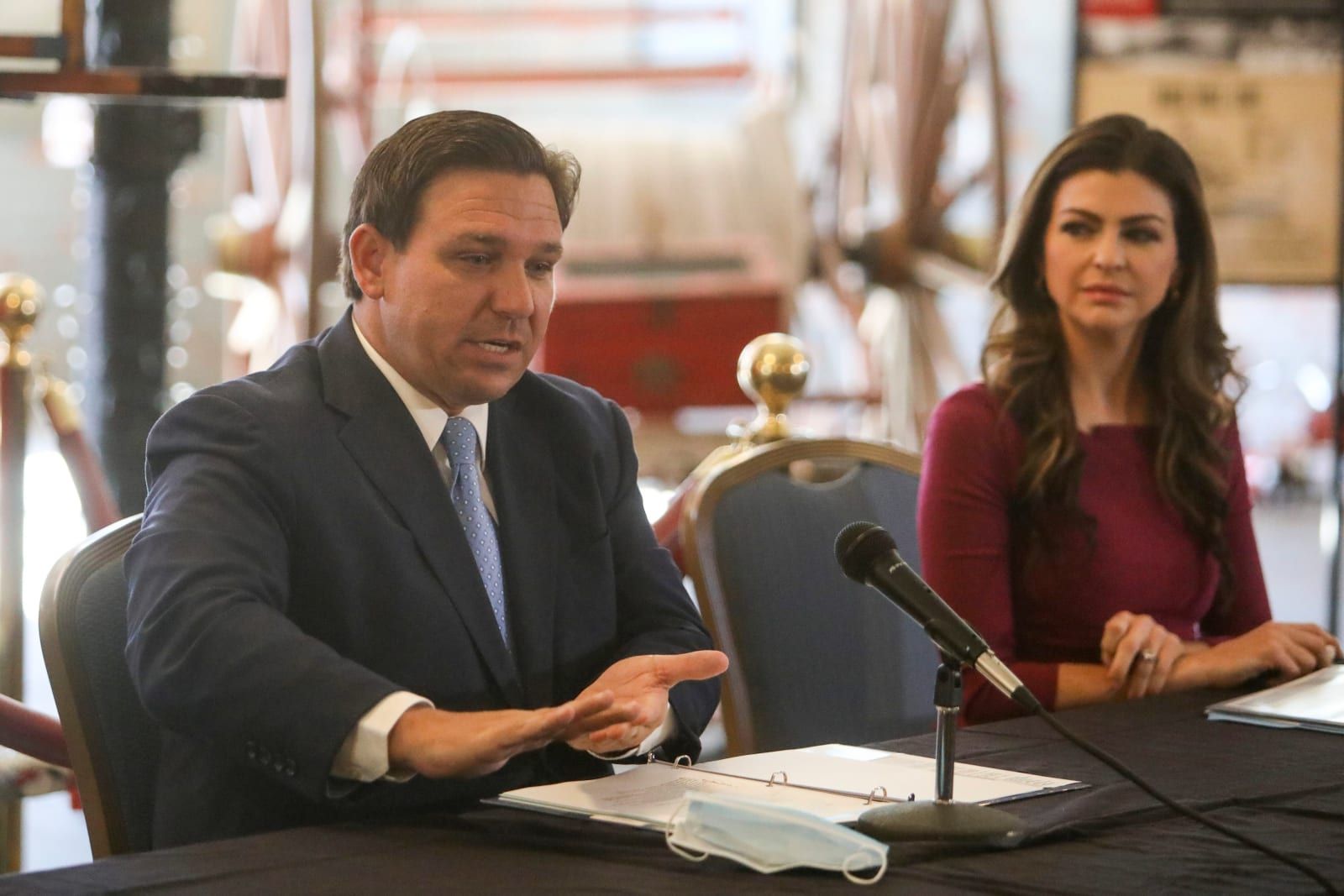 Ron DeSantis answers questions while First Lady Casey DeSantis listens following a roundtable discussion regarding mental health at the downtown Tampa Firefighter Museum on Friday, Dec. 11, 2020. - Ivy Ceballo/Times/Tampa Bay Times/TNS