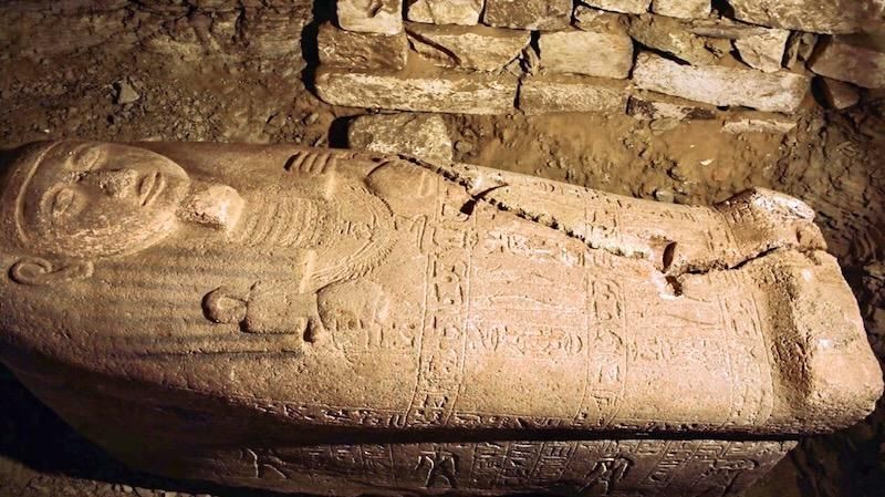 The current excavation season revealed the granite sarcophagus, "covered in texts" to "safeguard the deceased" and "scenes representing the sons of the god Horus," according to the antiquities ministry.