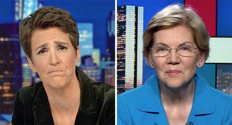 Composite image of MSNBC anchor Rachel Maddow interviewing Sen. Elizabeth Warren (screengrab)