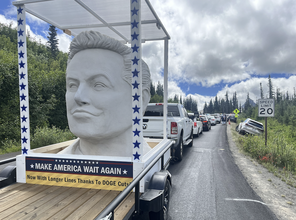 For the last three weekends, a giant Musk head has appeared in crowded parking lots and long lines of people waiting to enter the parks. This past weekend, the head appeared at Mount Rainier National Park in Washington State with a sign stating “Make America Wait Again” and “Now With Longer Lines Thanks To DOGE Cuts!”