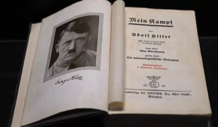 View of a copy of Adolf Hitler's book "Mein Kampf" (My Struggle) displayed at the Holocaust Museum in Buenos Aires on November 29, 2019. © Juan Mabromata, AFP