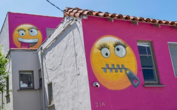 A house painted bright pink and adorned with two giant "emoji" faces is the latest salvo in a bitter feud between neighbors of a wealthy Los Angeles area beach town.