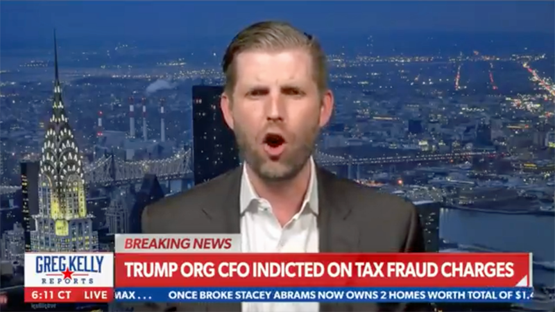Eric Trump went on Newsmax on Thursday to respond to the Trump Organization being charged with 15 counts of crime.