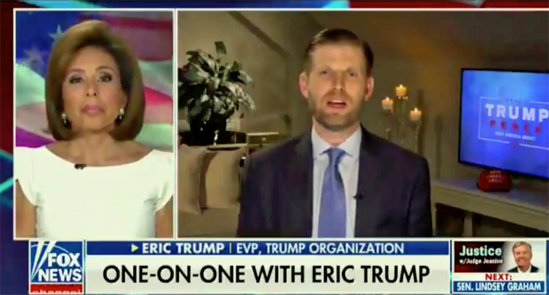 President Donald Trump's son Eric suggested that coronavirus lockdowns were a conspiracy to keep his father from holding 2020 campaign rallies during a Saturday appearance on Fox News with Jeanine Pirro.