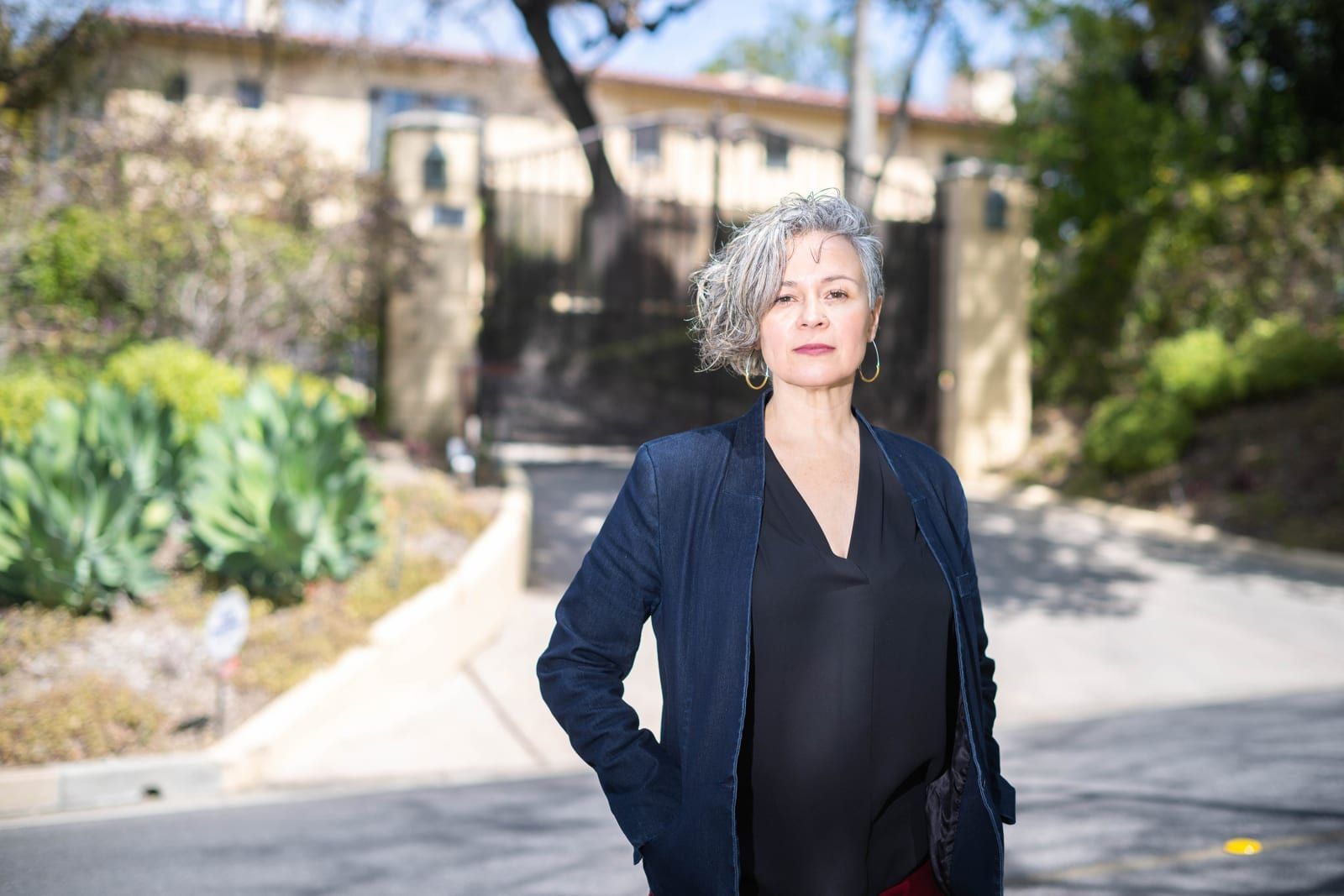 Gabriela Sandoval, executive director of the Excessive Wealth Disorder Institute, stands before home in San Marino, California, that is on the market for $21 million, on April 6, 2023. - Sarah Reingewirtz/Los Angeles Daily News/TNS