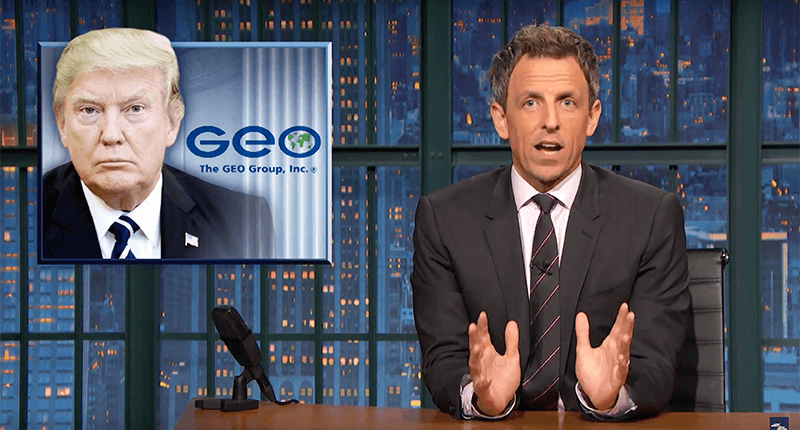 In a John Oliver-style expose on President Donald Trump's ties to private prisons, "Late Night" host Seth Meyers attacked the shocking examples of Trump throwing contracts to those who give him cash.