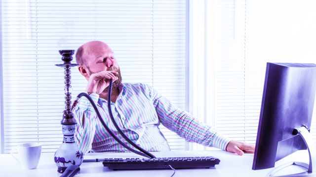 [Office worker smoking water pipe in his office via Shutterstock.com]