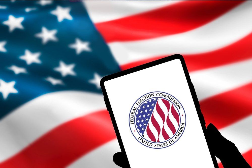 Federal Election Commission logo on smartphone screen against the background of the USA flag. (Photo credit: PalSand / Shutterstock)