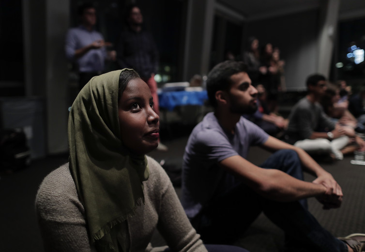 Fadumo Osman, left, political director for NYU College Democrats, watches the presidential debate, Oct. 19, 2016.
