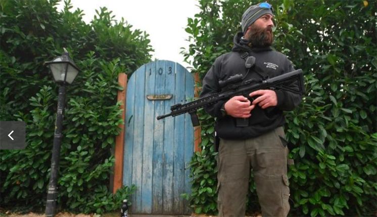 Matt Watts, semi-automatic rifle in hand and pistol in his belt, is standing watch at his property to keep potential pillagers at bay.