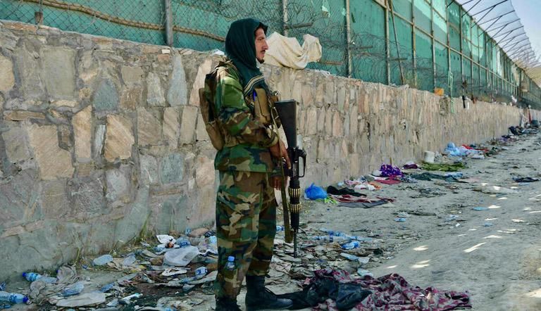 A Taliban fighter stands guard at the site of the August 26 suicide attack at Kabul airport on August 27, 2021. © Wakil Kohsar, AFP
