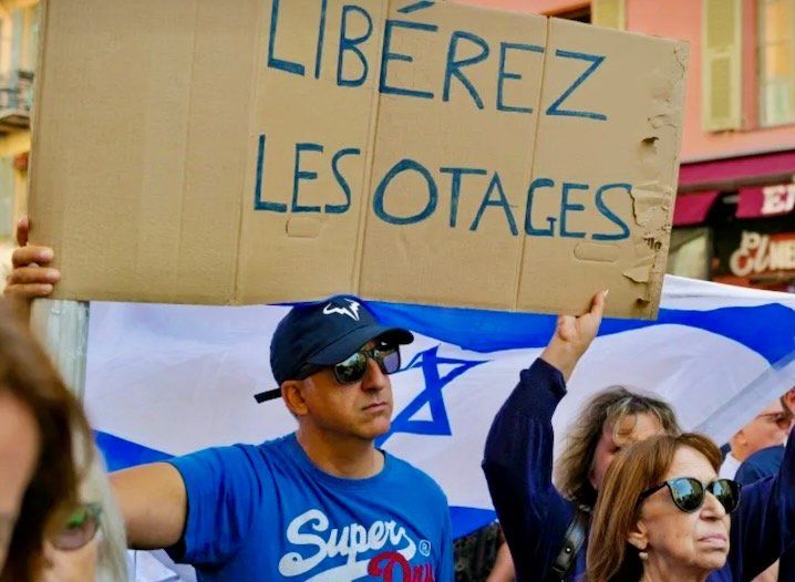 A demonstrator holds a placard reading "Free the hostages" during a rally in support of the people of Israel on the French riviera city of Nice (Valery HACHE/AFP)