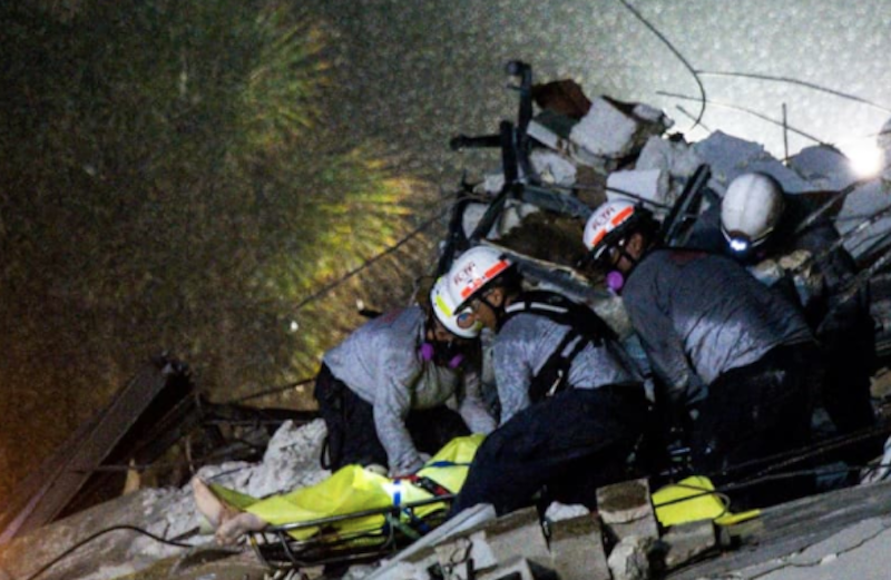 Search and rescue personnel pull a body out of the rubble after the partial collapse of the Champlain Towers South in Surfside, north of Miami Beach