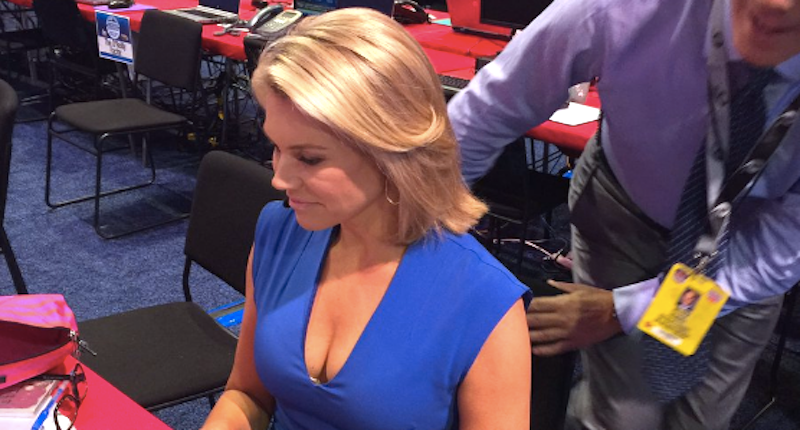 The photo is centered on news anchor Heather Nauert's cleavage, which is revealed in a low-cut sleeveless dress, as she's working at her desk.