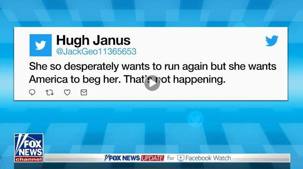 "She so desperately wants to run again but she wants America to beg her," a tweet displayed by Fox News said on Wednesday. "That's not happening."