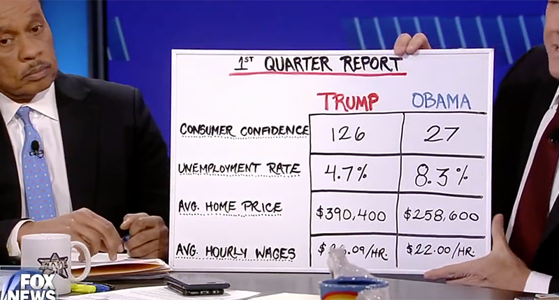 Fox News hosts on "The Five" sought to compare President Donald Trump's first economic quarter with President Barack Obama's first quarter. According to them, and probably to Trump in a Tweet at a later date, Trump seems to have saved the economy in the last eight years.