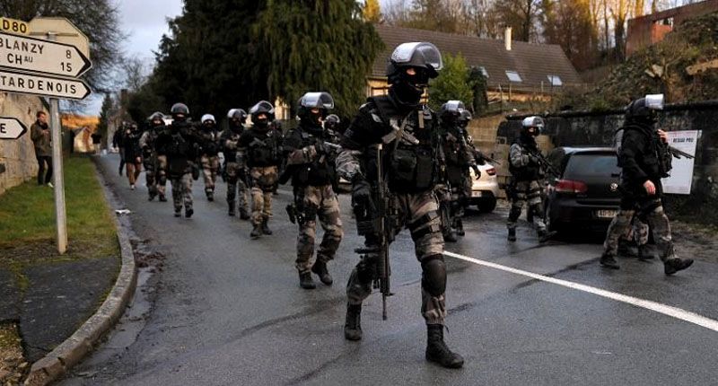 French police special forces march through Corcy as they search for the suspected Charlie Hebdo gunmen in northern France, on January 8, 2015 (AFP)