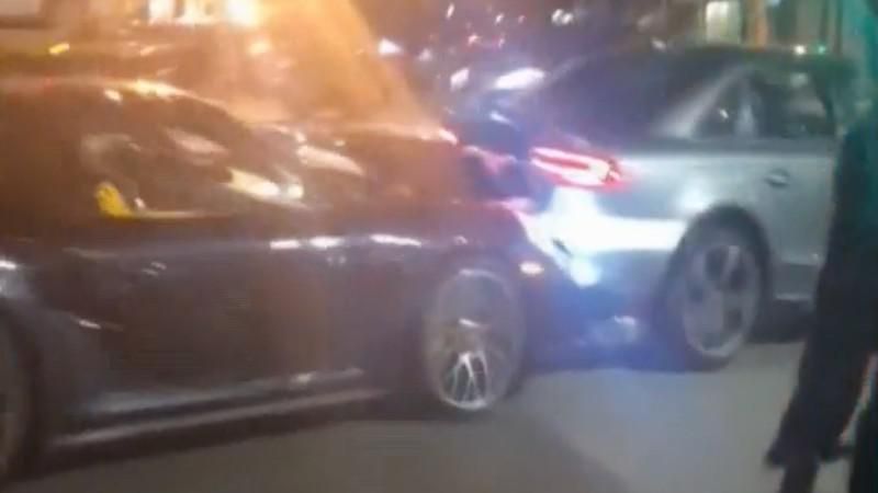 Shocking video obtained by San Francisco Bay Area television networks reportedly shows a longtime local Fox anchor using his Porsche to push a car through an intersection.