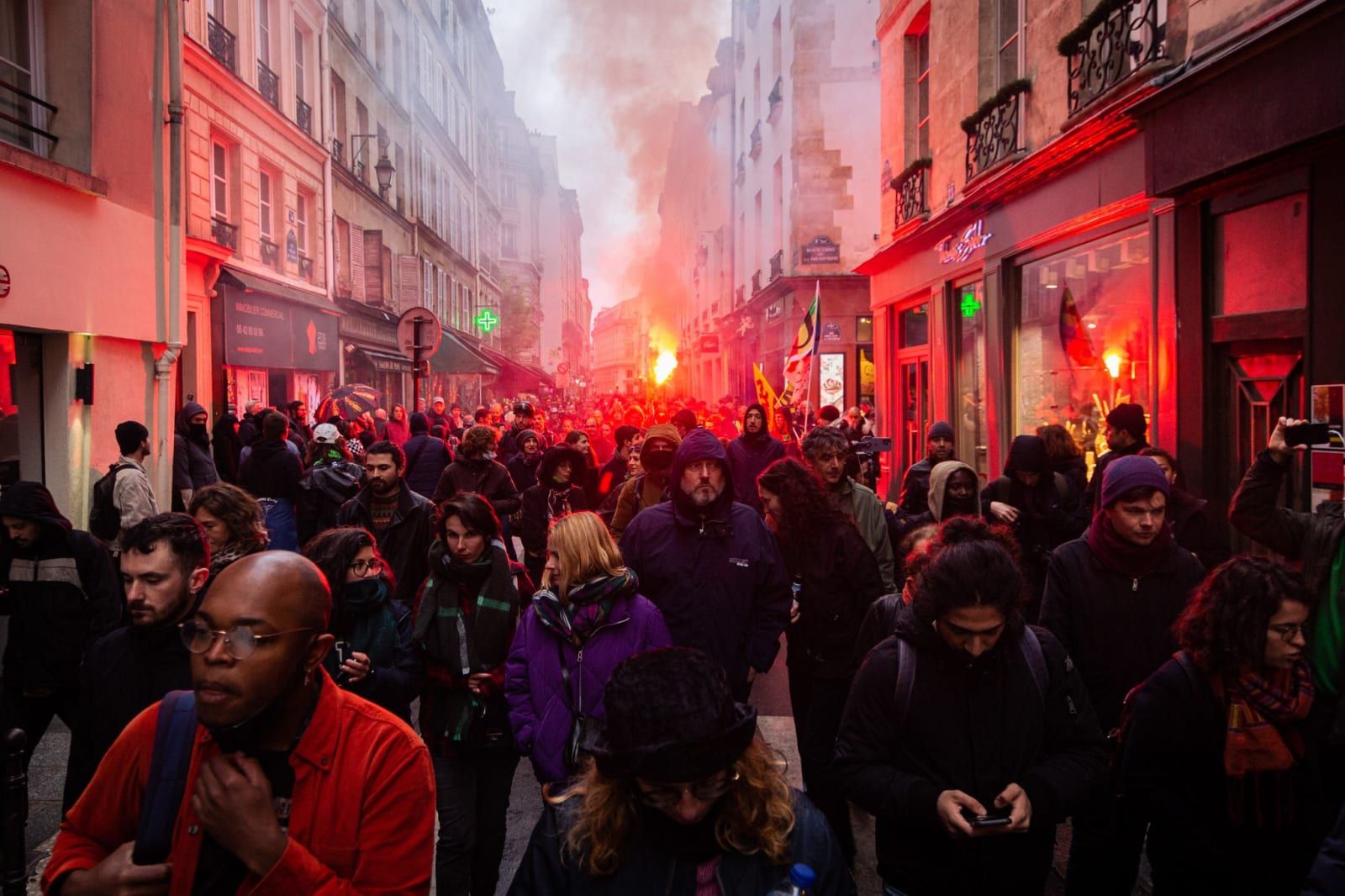 Protesters march on the streets holding red smoke flares during a demonstration over the Constitutional Council decision. French Constitutional Council approved the unpopular bill of Macron's government to raise the retirement age to 64. Telmo Pinto/SOPA Images via ZUMA Press Wire/dpa