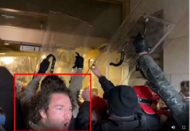 • Patrick McCaughey III is accused of pinning MPD Officer Daniel Hodges against the lower west terrace door with a riot shield as another rioter ripped off the officer's gas mask, exposing his bloody mouth. Numerous other rioters behind and around McCaughey reportedly pressed up against him, putting pressure on Officer Hodges.